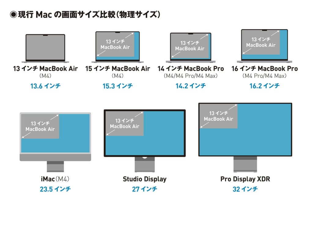 - 13インチMacBook Air(M4):13.6インチ