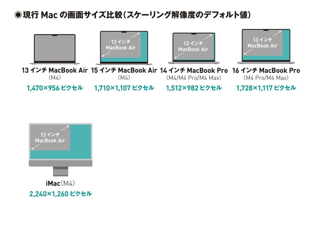 現行Macの画面サイズを図にして並べてみました。図にすることで、それぞれの大きさの違いがより具体的にイメージできるのではないでしょうか。今回は、物理サイズの差、ピクセルサイズの差、さらにスケーリング解像度のデフォルト値の差をそれぞれ比較していきます。
