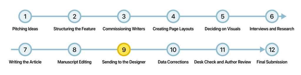 Once the manuscript is ready, I send it to the designer. For substantial content like features, I send pages incrementally as they’re completed.